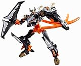 ビークルモード。SFジェット(スペースファイター)に変形。ロボットモード同様、オリジナルに忠実なリメイクで、旧玩具と形状もとても似ています。どことなく顔っぽく見える機首部分や独特な前進翼の形状もあり、どことなくコウモリっぽさを感じさせる見た目がカッコイイ。